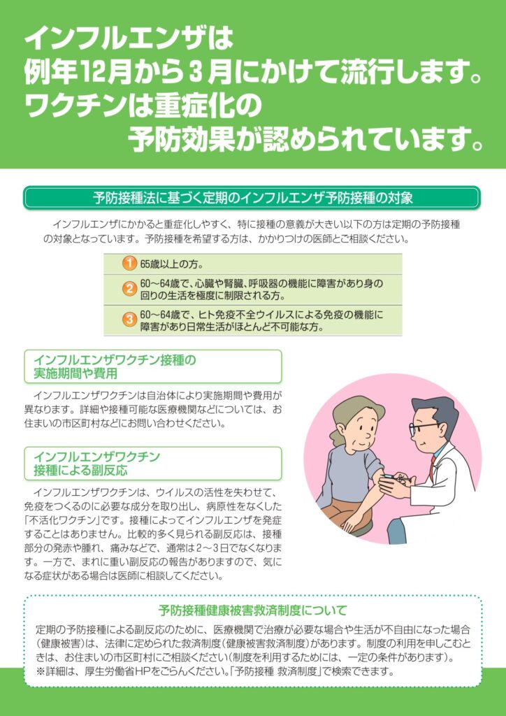 インフルエンザ予防に関するパンフレット(厚労省作成)(手洗い・咳エチケット・予防接種などの公式ガイド)